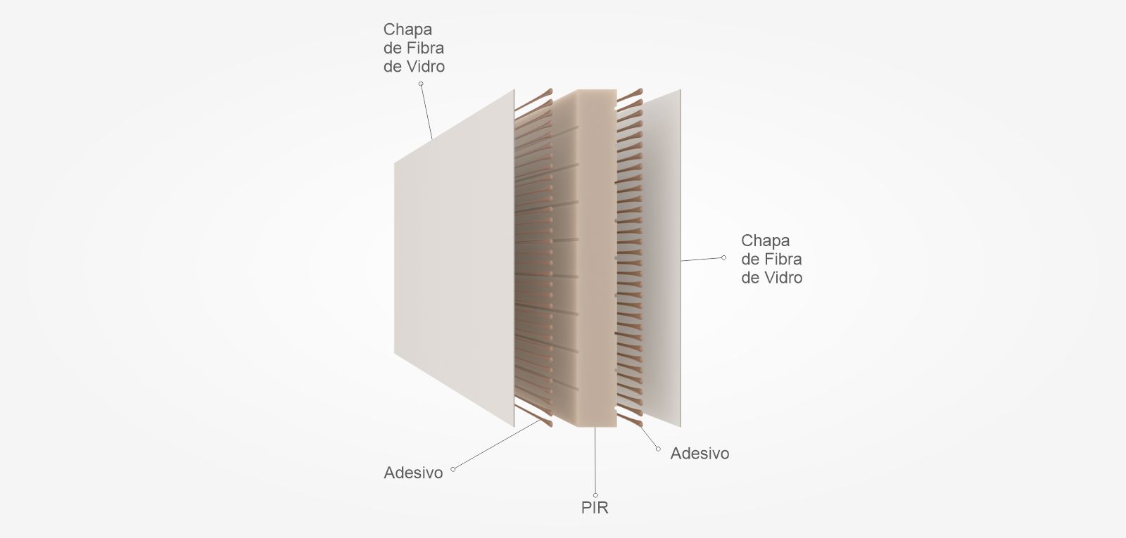 Poliéster reforçado com fibra de vidro (PRFV) – Material altamente resistente, que protege contra impactos e variações climáticas, garantindo durabilidade e segurança. Núcleo PIR (poliisocianurato) – Proporciona isolamento térmico e acústico superior, reduzindo o consumo de energia e tornando os ambientes mais confortáveis.